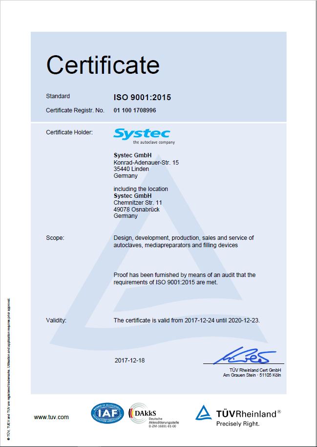 Systec GmbH & Co. KG 成立于1994年,是專業(yè)從事高壓滅菌設(shè)備(蒸汽滅菌器)研發(fā)與制造的企業(yè),核心產(chǎn)品涵蓋實驗室級高壓滅菌器、培養(yǎng)基制備系統(tǒng)以及液體培養(yǎng)基與微生物培養(yǎng)基分裝裝置。公司通過ISO 9001質(zhì)量管理體系及ISO 14001環(huán)境管理體系雙重認(rèn)證,致力于為現(xiàn)代實驗室、科研機構(gòu)以及生物技術(shù)、制藥、質(zhì)量控制和工業(yè)生產(chǎn)領(lǐng)域提供多元化產(chǎn)品組合。Systec高壓滅菌設(shè)備在全球市場擁有逾30年成熟應(yīng)用經(jīng)驗,既作為實驗室級滅菌設(shè)備服務(wù)于科研領(lǐng)域,也作為工業(yè)級滅菌設(shè)備(例如制藥工業(yè)中的生產(chǎn)型滅菌設(shè)備或食品工業(yè)滅菌解決方案)在工業(yè)化生產(chǎn)場景中實現(xiàn)高效滅菌工藝,其技術(shù)可靠性和流程合規(guī)性已獲得國際制藥與食品生產(chǎn)行業(yè)的廣泛認(rèn)可。